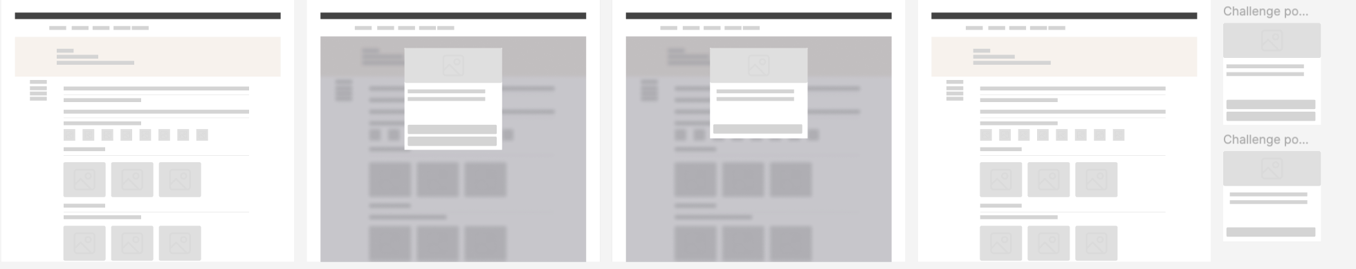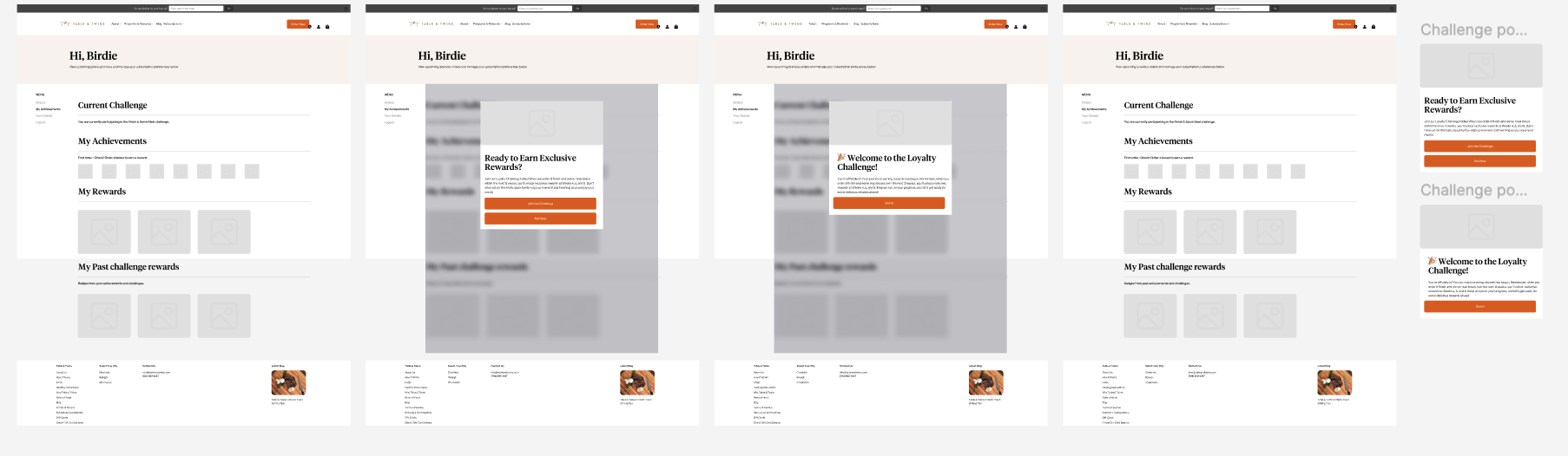 Following our user research, we collaborated with stakeholders in a workshop to outline key UX requirements that would shape the Loyalty Challenge experience. These requirements emphasized creating a seamless and engaging journey for participants. We identified the need for multiple, easy-to-find entry points to activate rewards, supported by clear progress indicators to keep users motivated. A straightforward onboarding overlay was prioritized to ensure users could easily understand the challenge, while simple reward redemption processes would maintain accessibility. To build excitement, we incorporated concealed rewards to spark anticipation, accompanied by clear challenge rules for transparency. Additionally, visual cues were deemed essential to highlight unclaimed rewards, encouraging users to take action. These insights laid the foundation for our wireframes, bringing these user-focused elements to life in the design.